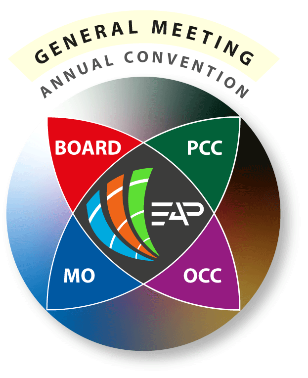 However, the governing body of the EAP Association is the General Meeting. Its Board of Officers is elected for three years. It is composed by a president, a vice-president, a general secretary, a treasurer. In adjunction, the General Meeting has also elected its board (for the 2023-2026 period) an administrative secretary, the head of the QMP (Quality Meeting program). the head of the Code of Conduct, the head of Sustainability (Environmental impact) and the head of EAP Future (U18 development).